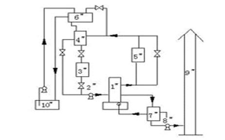 焦化廠采用的導(dǎo)熱油爐可以高爐煤氣為燃料,以導(dǎo)熱油為熱載體,通過熱油泵強(qiáng)制循環(huán),將熱量傳遞給各塔加熱設(shè)備?! 」に嚵鞒倘鐖D1所示。熱載體導(dǎo)熱油用熱油泵2#送入導(dǎo)熱油爐1#,經(jīng)導(dǎo)熱油爐加熱到220~240℃后,再送入蒸餾塔加熱器5#進(jìn)行加熱,此時導(dǎo)熱油溫度降為200℃。導(dǎo)熱油再經(jīng)4#氣液分離器、3#過濾器后,回到熱油泵進(jìn)口,這樣就形成了加熱利用——再加熱再利用的閉路循環(huán)系統(tǒng)。10#貯油槽、6#膨脹槽的作用是及時補(bǔ)充循環(huán)系統(tǒng)中損失的導(dǎo)熱油。在導(dǎo)熱油爐內(nèi)高爐煤氣燃燒后產(chǎn)生的廢氣,經(jīng)7#高爐煤氣換熱后,降至250℃以下,用8#引風(fēng)機(jī)經(jīng)9#煙囪排出。高爐煤氣經(jīng)換熱后由30℃升高到180℃。