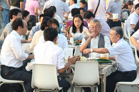17:30,志賀進(jìn)總經(jīng)理端著酒杯,走到舞臺前,首先感謝廣大員工的辛勤努力,使公司取得很好的業(yè)績,隨著一聲“干杯”,荏原博泵第五屆納涼晚會拉開了序幕。公司380多名員工,分部門有序而坐,大家推杯換盞,興高采烈。公司領(lǐng)導(dǎo)挨桌給員工們敬酒,大家沒有了上下級的拘謹(jǐn),一派歡樂祥和的景象。